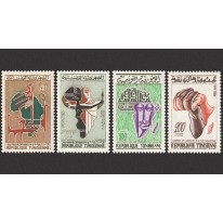 Doskonale zaprojektowane znaczki upamiętniające Dzień Afryki. Widnieją na nich postacie, twarze i dłonie wpisane w mapę kontynentu afrykańskiego.
