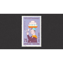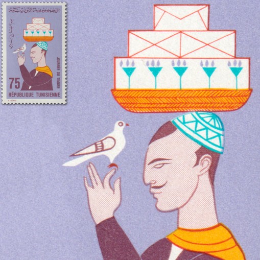 Znaczek wydany na Dzień Znaczka. Widnieje na nim listonosz z gołębiem w ręku, niosący na głowie paczki i listy.