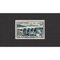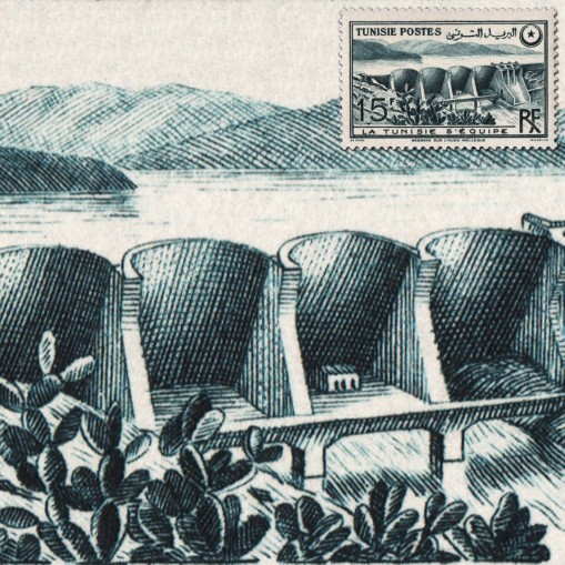 Znaczek obiegowy, na którym przedstawiono zaporę wodną na rzece Melleg.