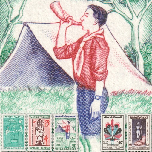 Znaczki upamiętniające czwarty zlot skautów krajów arabskich w Tunisie. Na znaczkach widnieją piękne przedstawienia motywów harcerskich.