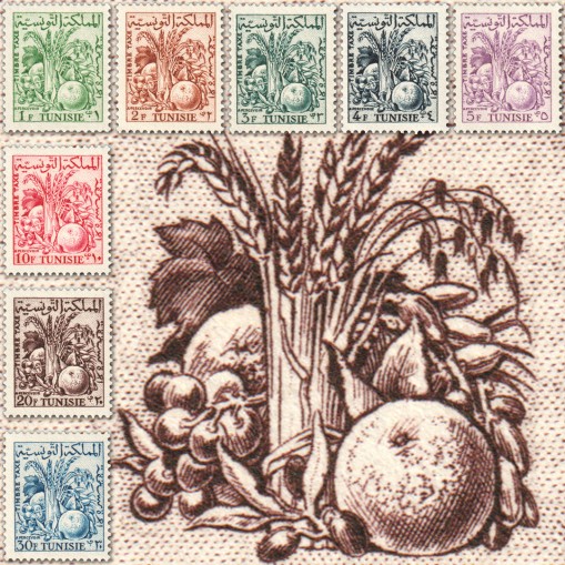Na znaczkach przedstawiono plony rolne: owoce, warzywa i kłosy zboża.