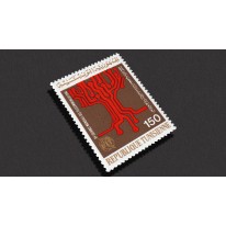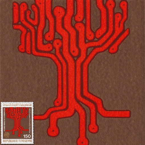 Znaczek upamiętniający Światowy Dzień Telekomunikacji. Na znaczku widnieje płytka obwodu drukowanego stylizowana na drzewo.