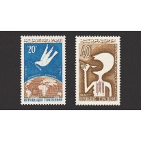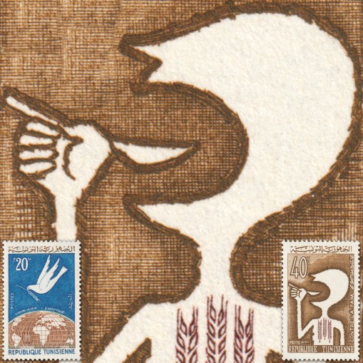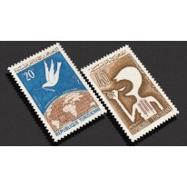 Znaczki promujące walkę z głodem na świecie. Widnieje na nich postać z łyżką w dłoni oraz gołąbek pokoju ponad globem ziemskim.