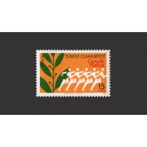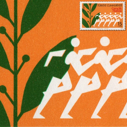 Na znaczku widnieją biegacze i gałązka oliwna.