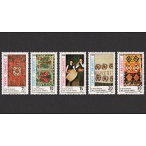 Na znaczkach widnieją kolejno: dywan, haft, muzycy z tradycyjnymi instrumentami, makrama i kilim.