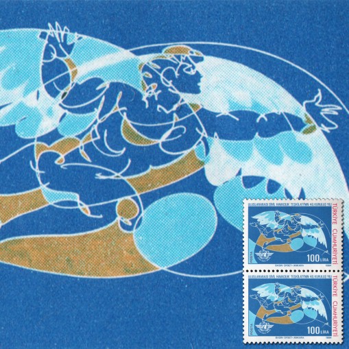 Znaczek w parce upamiętniający 40-lecie Organizacji Międzynarodowego Lotnictwa Cywilnego.