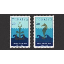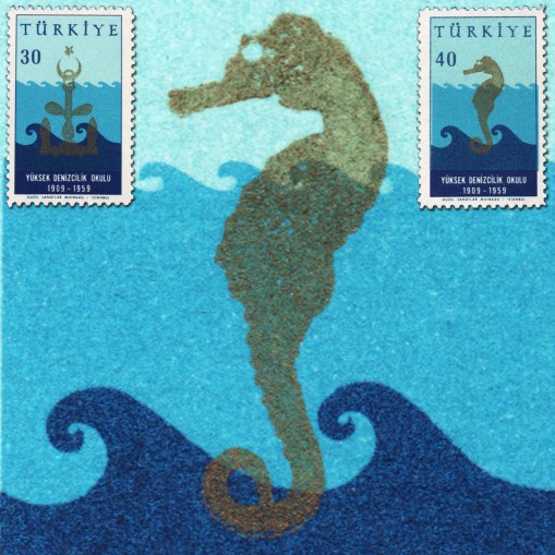 Na znaczkach widnieją fale morskie oraz kotwica i konik morski.