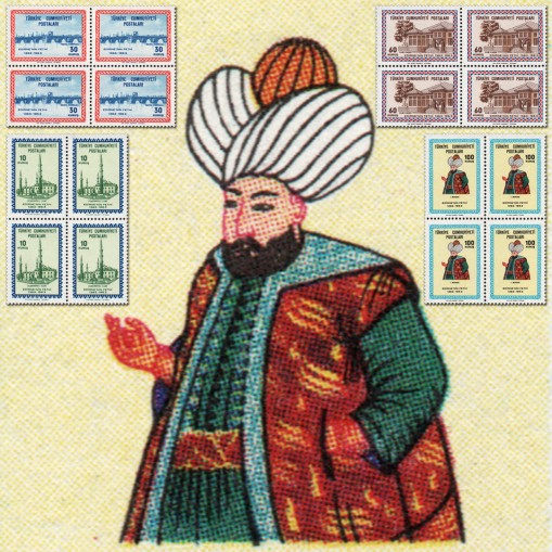 Na znaczkach widnieje meczet, most, pawilon i sułtan Amurat I.