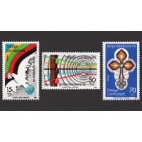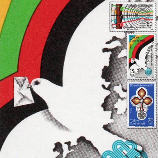 Na znaczkach widnieje gołąbek z listem, słup telefoniczny i logo tegoż Roku.