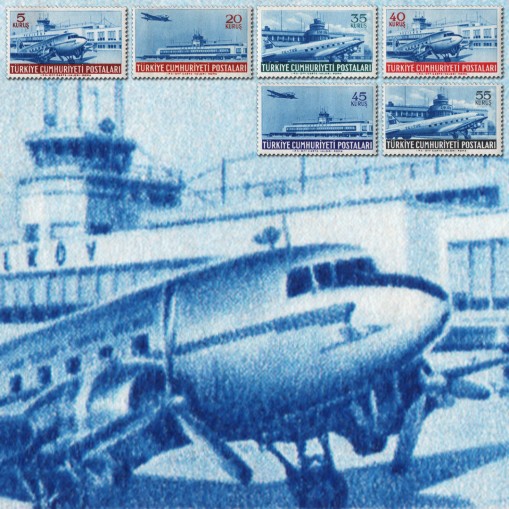 Seria znaczków lotniczych, na których widnie samolot Douglas DC 3 na lotniskach w Stambule i Ankarze.