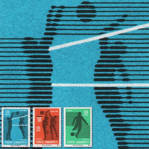 Seria obiegowa, na znaczkach której widnieje siatkówka, koszykówka i piłka nożna.