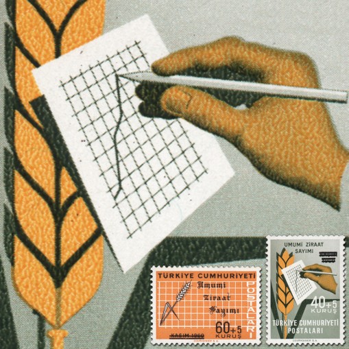 Seria promująca spis rolny. Są to nie dopuszczone wcześniej do obiegu walory z przekreślonym napisem „Kasim 1960” i nadrukowanym tekstem „Umumi Ziraat Sayimi”.