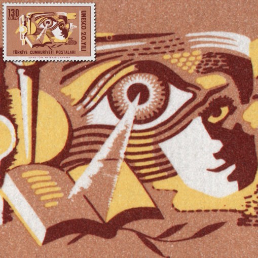 Na znaczku widnieją symbole edukacji, nauki i kultury.