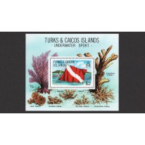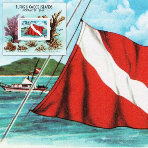 Znaczek w bloku, na którym widnieje flaga sygnalizująca nurka pod wodą.