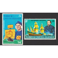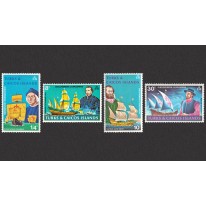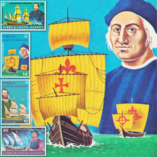 Na znaczkach widnieją słynni odkrywcy i ich żaglowce, kolejno: