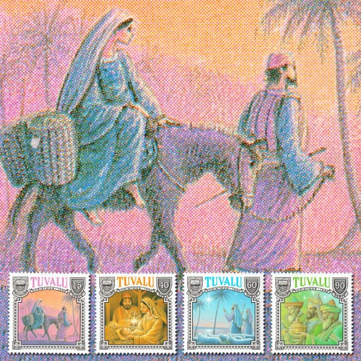 Na znaczkach przedstawiono sceny o tematyce bożonarodzeniowej: Józefa i Maryję na osiołku, Świętą Rodzinę z Dzieciątkiem w stajence, pasterzy obserwujących gwiazdę Betlejemską oraz Trzech Króli.