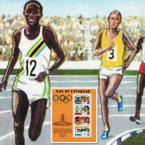 Na znaczkach widnieją sportowcy: Akii Bua w biegu przez płotki, biegacz długodystansowy Filbert Bayi i bokser Steve Muchoki, a także flagi Kenii, Tanzanii i Ugandy.