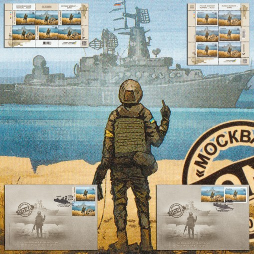 Znaczki te (w dwóch nominałach: jako opłata za list krajowy oraz zagraniczny) zostały wydane 23. maja 2022 roku na fali popularności waloru o bardzo podobnym projekcie wydanego 12. kwietnia 2022 roku, dwa dni przed zatopieniem „Moskwy”, i celebrującego słynną odpowiedź ukraińskich obrońców Wyspy Wężowej na wezwanie Rosjan do poddania się („Rosyjski okręcie wojenny, idź w…”), która została rozpowszechniona w trakcie rosyjskiej inwazji na Ukrainę w 2022 roku. Grafika pierwotnego znaczka (żołnierz pokazujący okrętowi środkowy palec) znalazła się teraz na przywieszce z dodatkowym napisem „‘Moskwa’ DONE 14.4.2022”, a na właściwym znaczku widnieje sam żołnierz, już bez okrętu. Ta sama grafika z okrętem widoczna jest na kopertach FDC. Kasowniki są okolicznościowe i przedstawiają tonący statek.