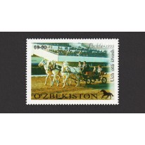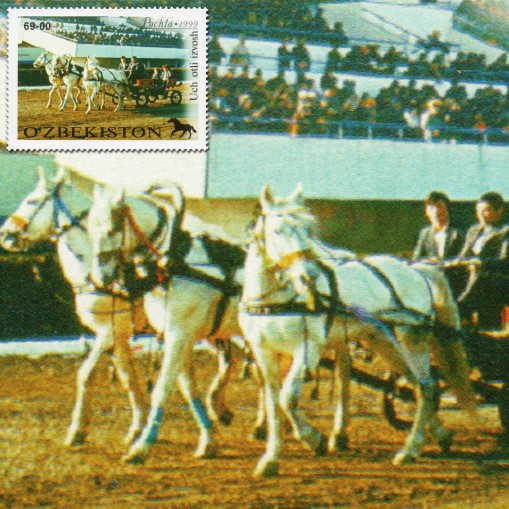 Znaczek, na którym widnieje trójkonny zaprzęg konny, tzw. trojka.