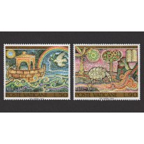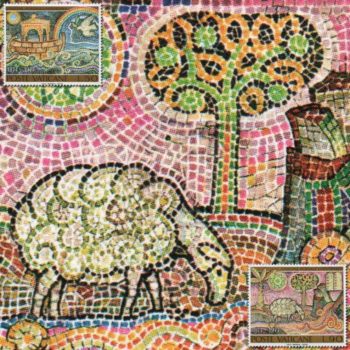 Na znaczkach widnieją mozaiki przedstawiające arkę Noego i owcę.