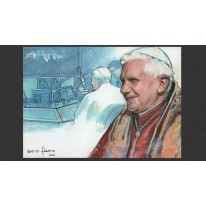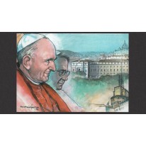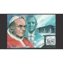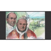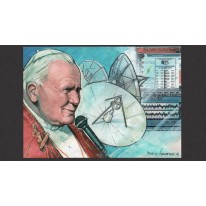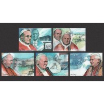 Zestaw pięciu okolicznościowych kartek pocztowych z nadrukowanymi znaczkami upamiętniający 75-lecie radia watykańskiego.