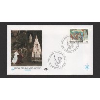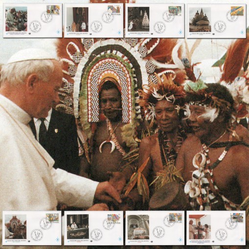 Na znaczkach widnieje Ojciec Święty w Ameryce Środkowej, w Polsce, we francuskim Lourdes, w Austrii, w Azji, w Szwajcarii, w Kanadzie i na Dominikanie.