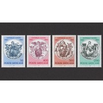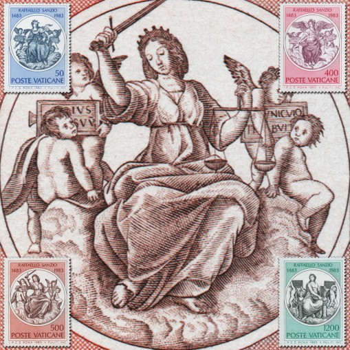 Na znaczkach widnieją freski z Pałacu Watykańskiego (z pomieszczenia zwanego Stanza della Segnatura) przedstawiające kolejno alegorie Teologii, Poezji, Sprawiedliwości i Filozofii.
