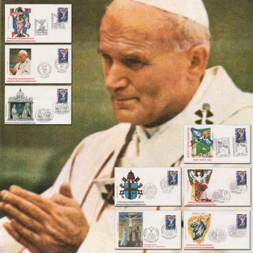 Kompletny zestaw ośmiu okolicznościowych kopert (z których pierwsza jest kopertą pierwszego dnia obiegu) celebrujących ogłoszenie przez Jana Pawła II roku 1983 Rokiem Świętym. W tradycji żydowskiej i chrześcijańskiej jest to czas szczególnej łaski, przypominający pochodzenie człowieka od Boga. W roku 1983 obchodzono Jubileusz z okazji 1950. rocznicy zbawczej śmierci Chrystusa.