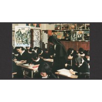 Na znaczkach i kartach widnieje Jan Bosko, salezjanka i salezjanin współpracownik nauczający młodzież.