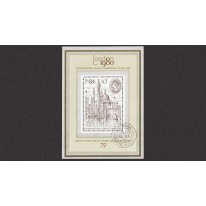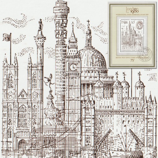 Znaczek kasowany grzecznościowo w bloku upamiętniający Międzynarodową Wystawę Filatelistyczną „London’80”.