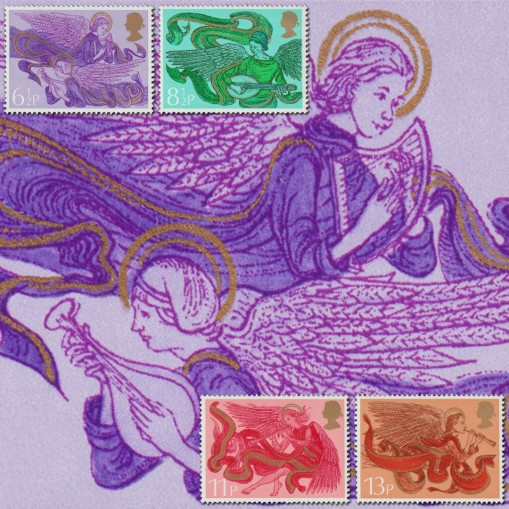 Na znaczkach widnieją anioły grające na harfie i lutni, na mandolinie, na rogu i na bębnie.