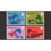 Na znaczkach widnieją gospodyni domowa, policjant, pielęgniarka i pracownik budowlany rozmawiający przez telefon.