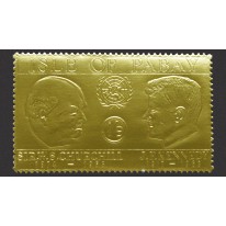 Nieautoryzowany złoty znaczek, na którym widnieją Winston Churchill i John F. Kennedy.