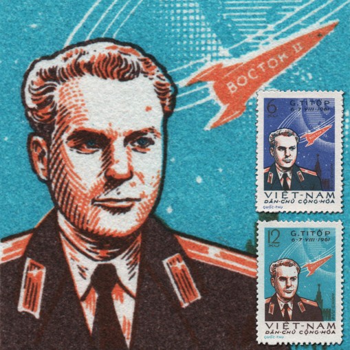 Na znaczkach widnieje radziecki kosmonauta Gierman Titow, który jako pierwszy przebywał na orbicie całą dobę i ręcznie sterował statkiem kosmicznym.