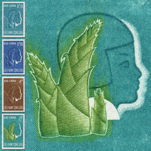 Na znaczkach widnieje twarz dziecka i kiełkujący bambus.