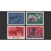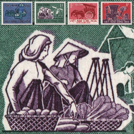 Seria, na znaczkach której widnieje życie codzienne w Wietnamie, kolejno: wędrowny sprzedawca, targ, zaprzęg konny i zbiór plonów.