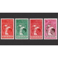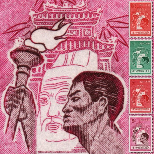 Na znaczkach widnieje Wietnamczyk ze zniczem na tle wietnamskiego budynku i twarzy Konfucjusza.