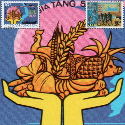 Na znaczkach widnieją kolejno dłonie trzymające produkty rolnicze przeznaczone na eksport oraz budowa kanałów nawadniających.