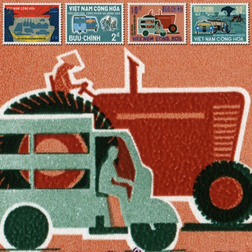 Na znaczkach widnieją środki transportu, rolnicy i robotnicy.