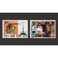 Na znaczkach widnieje waga symbolizująca sprawiedliwość i Wietnamczycy przy urnie wyborczej.