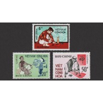Na znaczkach widnieją uczeni tworzący kaligrafie i uczący dzieci.