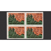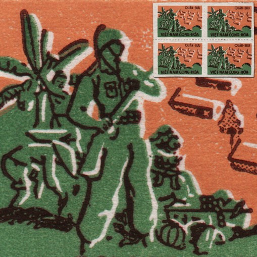 Znaczek emisji wojskowej w czwórce, na którym widnieją żołnierze pilnujący tajnej strefy w Wietnamie.