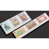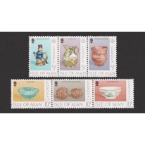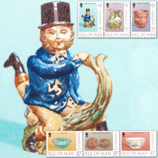 Na znaczkach przedstawiono mańskie wyroby ceramiczne, kolejno: