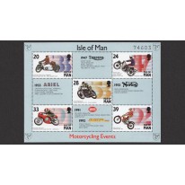 Znaczki w bloku, na których widnieją słynni kierowcy motocyklowi i ich maszyny podczas zawodów, kolejno: