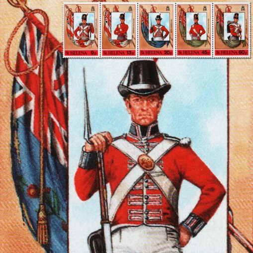 Na znaczkach widnieją mundury armii brytyjskiej z 1815 roku, kolejno: szeregowca i oficera 53. pułku piechoty, żołnierza marynarki wojennej oraz oficera i żołnierza 66. pułku piechoty.