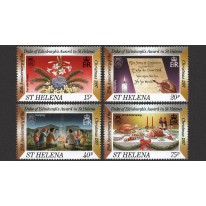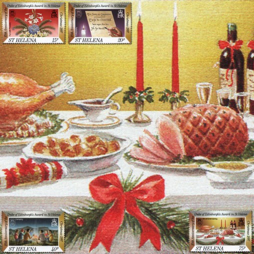 Na znaczkach widnieją kolejno: bożonarodzeniowy bukiet, kaligrafowane słowa kolędy, ognisko i stół nakryty do świątecznego obiadu.