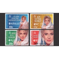 Na znaczkach widnieją tytuły i nuty popularnych kolęd angielskojęzycznych i amerykańska piosenkarka muzyki country Tammy Wynette.