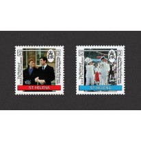 Na znaczkach widnieje młoda para oraz książę Andrew podczas wizyty na Wyspie Świętej Heleny.