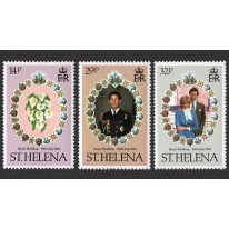 Na znaczkach widnieje bukiet ślubny z Wyspy Świętej Heleny, książę Karol w mundurze marynarki wojennej oraz nowożeńcy.