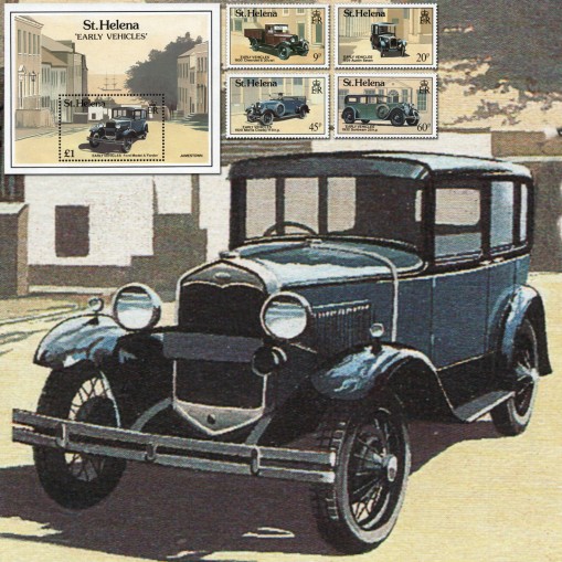 Na znaczkach widnieją wczesne modele samochodów, kolejno: